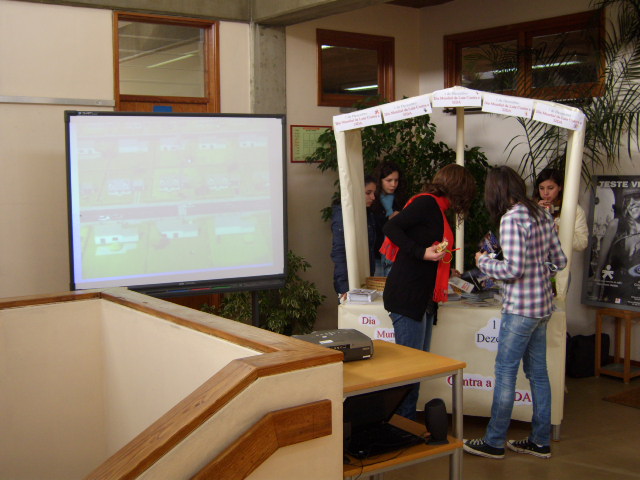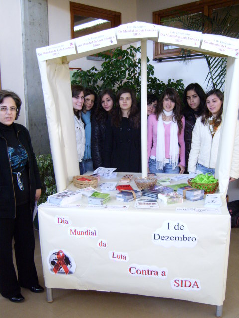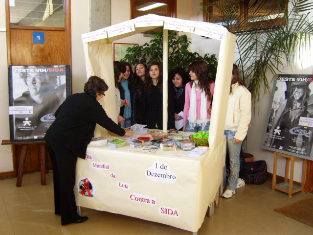 A Biblioteca associou-se hoje ao Projecto “Saúde Escolar” para assinalar o Dia Mundial da Luta Contra a SIDA, que se comemorará amanhã dia 1 de Dezembro. Para isso, a coordenadora do Projecto “Saúde Escolar”, professora Susana Pacheco e os alunos do 12º A criaram uma banca na entrada da BE, onde foi feita uma sensibilização a todos os alunos e professores para a importância deste dia, entregando guiões informativos, pins, pulseiras e preservativos (masculinos e femininos) junto das turmas do secundário.