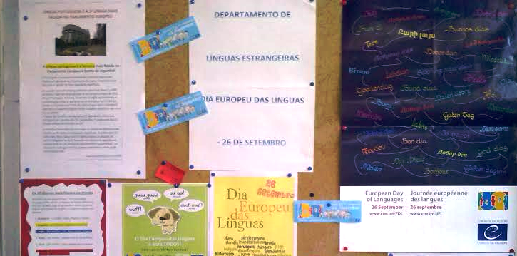 Mais uma vez os professores do Departamento de Línguas do agrupamento, em articulação com a Biblioteca, tiveram a iniciativa de comemorar esta efeméride com uma exposição de cartazes, textos e trabalhos escritos, tanto na entrada da Escola Secundária como no polivalente da Escola Básica de Lousada Centro, revelando a importância da riqueza multilinguística das 23 línguas faladas no espaço europeu.
