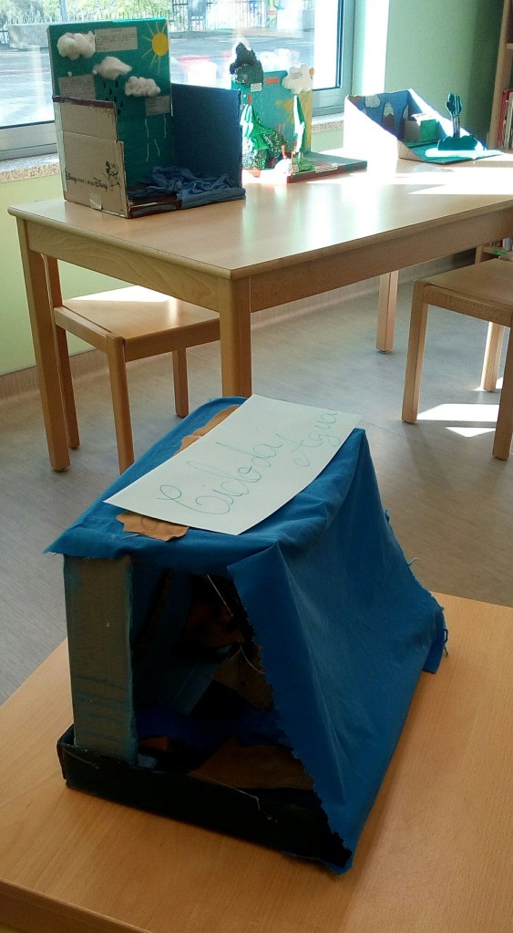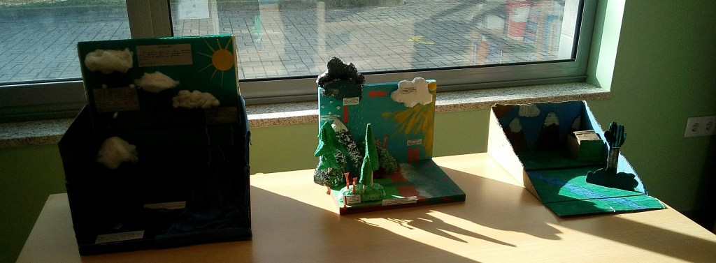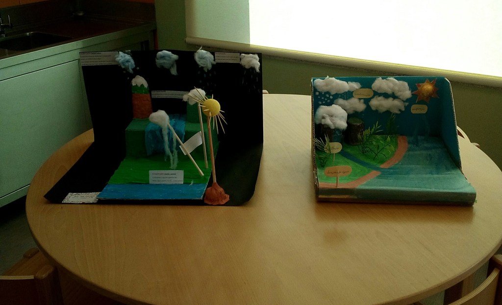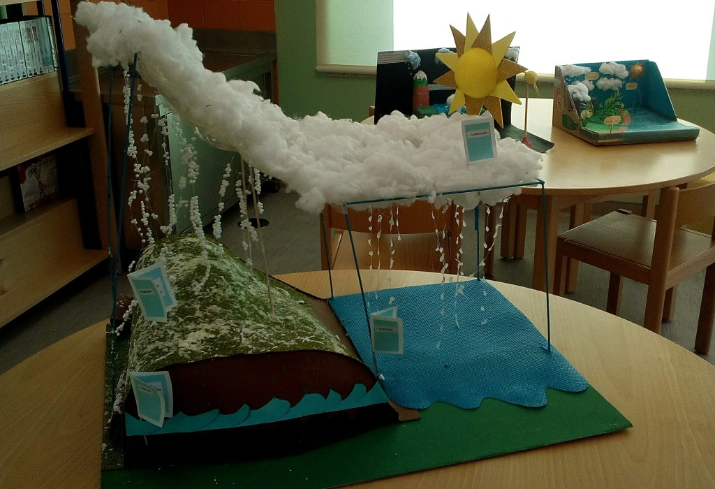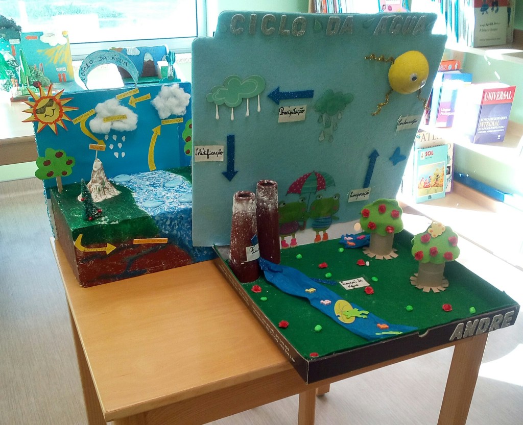 A ideia foi reforçar o conteúdo trabalhado nas aulas online, incentivando os alunos a ilustrarem o processo por meio de maquetas, explicando o ciclo da água, agora em exposição na Biblioteca.