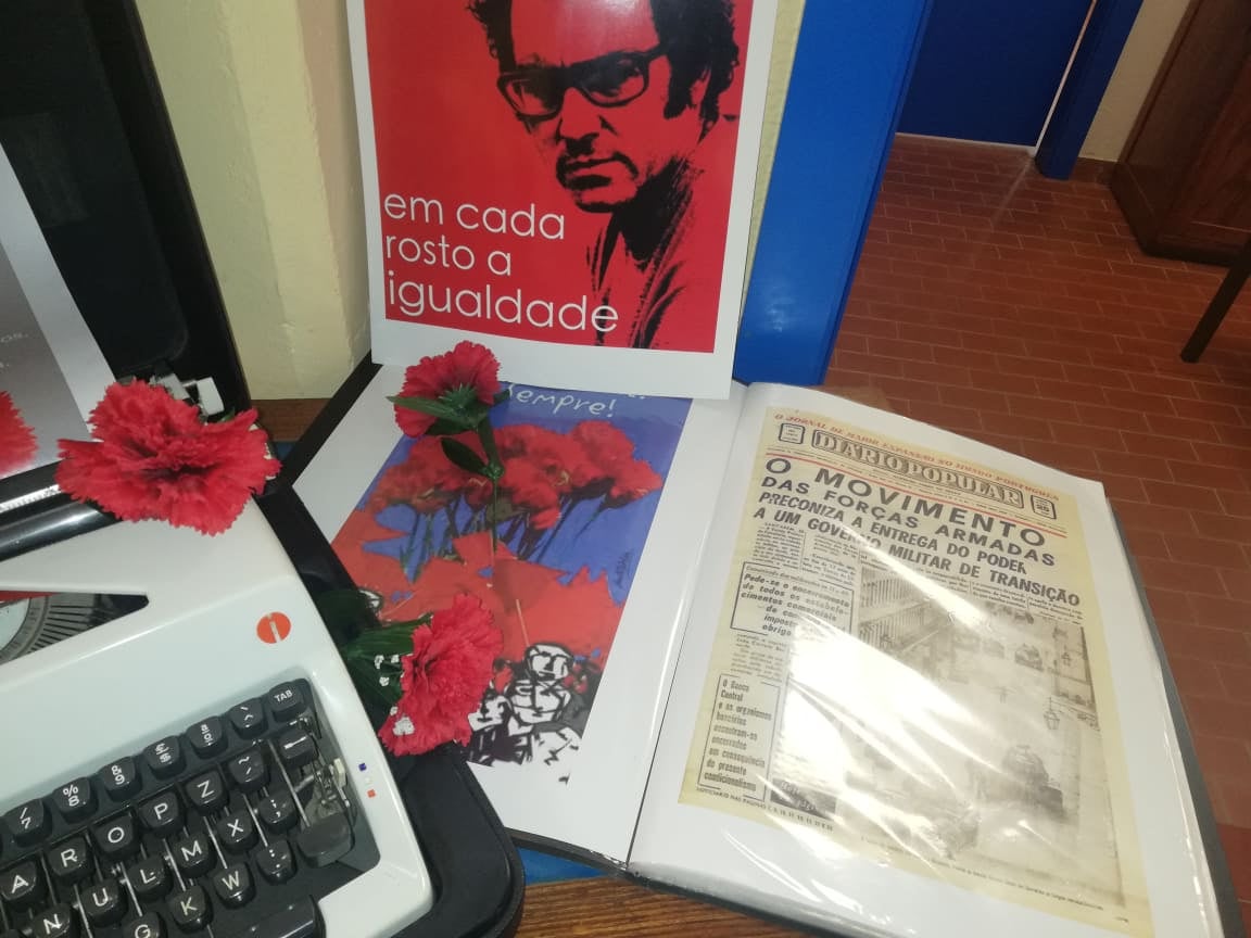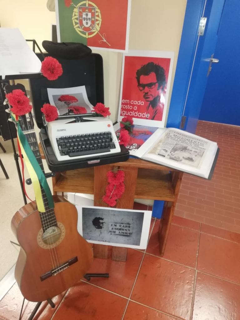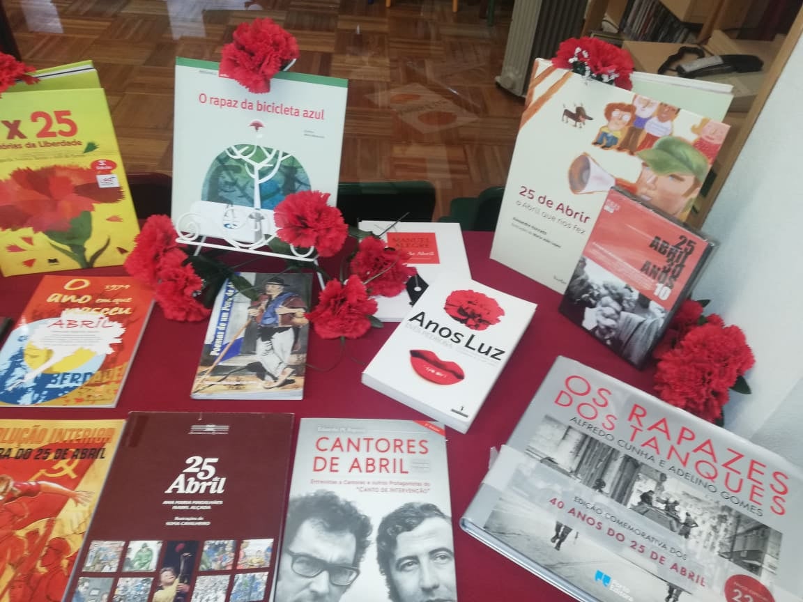 A equipa da Biblioteca da EB2,3 realizou uma exposição com o objetivo de comemorar o 25 de abril de 1974.
