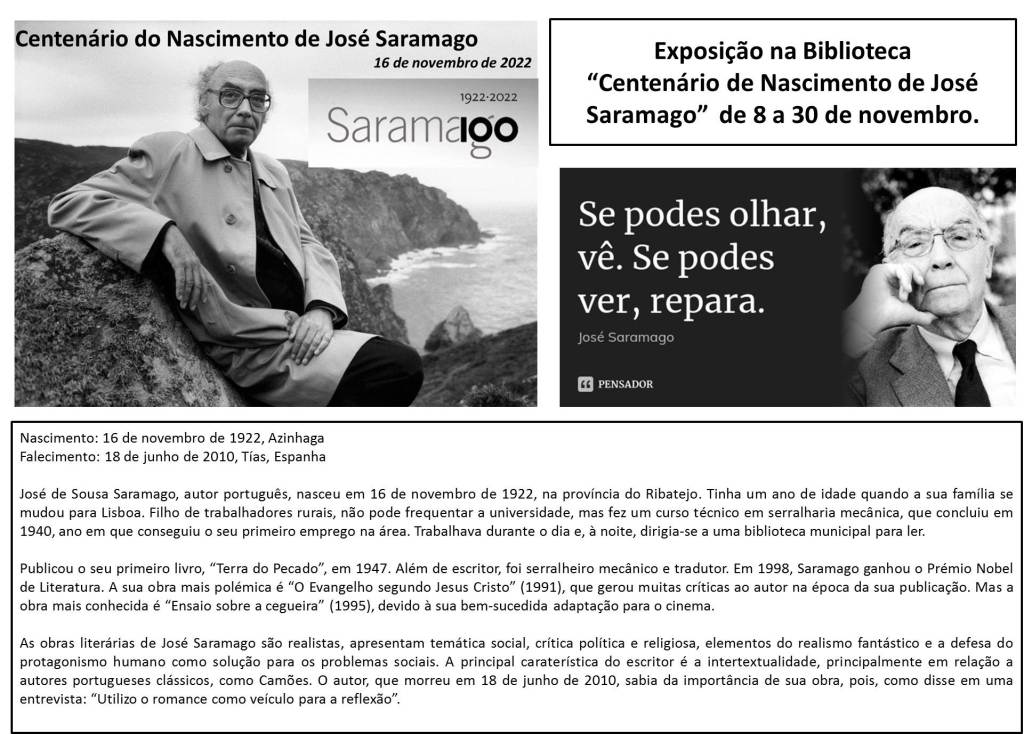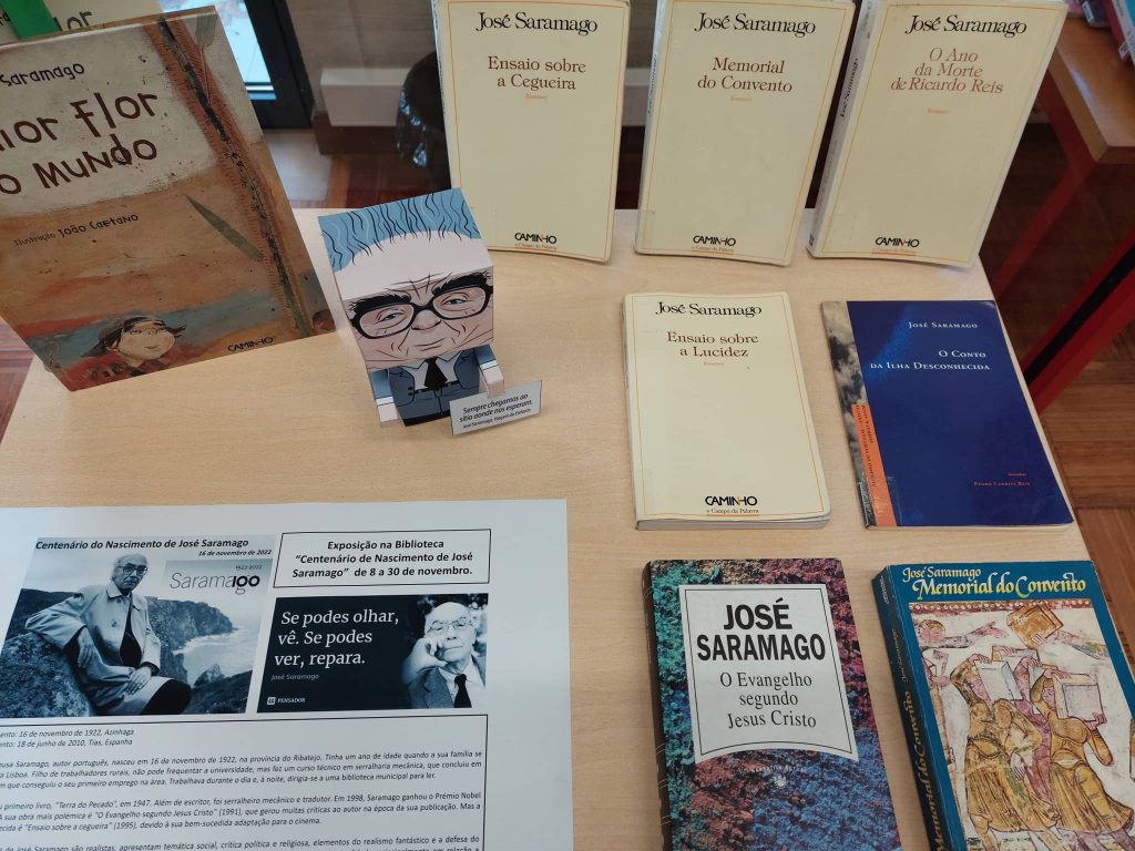 Nov18 Saramago homenageado na EBLC Posted on Novembro 18, 2022 by AFPA Padrão Centenário do Nascimento de José Saramago (1922-2022). Ontem, 16 de novembro, a Biblioteca da Escola Básica Lousada Centro celebrou o centenário do nascimento de José Saramago com uma exposição muito apelativa, que estará patente ao longo da semana. Partilha: Clique para partilhar no Facebook (Abre numa nova janela) Facebook Click to share on X (Abre numa nova janela) X Clique para partilhar no LinkedIn (Abre numa nova janela) LinkedIn Mais Carregue aqui para imprimir (Abre numa nova janela) Imprimir Clique para partilhar no WhatsApp (Abre numa nova janela) WhatsApp Carregue aqui para enviar por email a um amigo (Abre numa nova janela) E-mail Gosto Carregando... Relacionado
