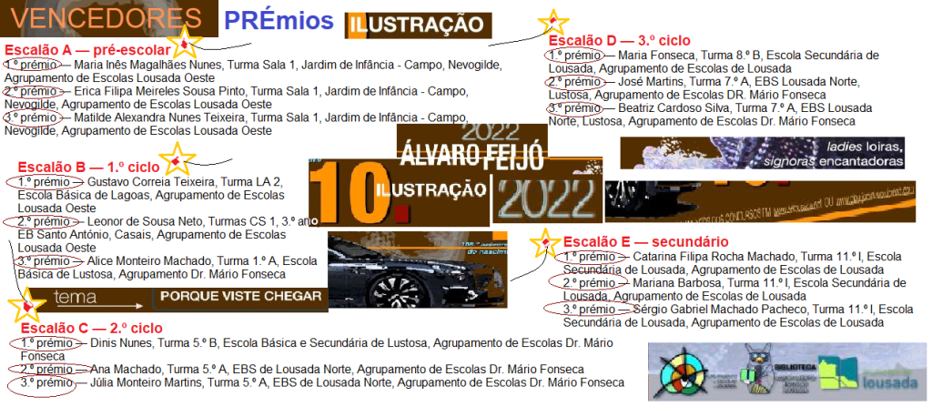 A Biblioteca e grupo disciplinar de Artes do Agrupamento de Escolas de Lousada têm o prazer de divulgar os resultados do 10.º Concurso de Ilustração, que visa desenvolver a leitura e a escrita, estimular o gosto pela ilustração e a criação de dinâmicas na sala de aula que possam desenvolver a criatividade das crianças e jovens. Foi aberto a toda a população escolar do concelho de Lousada, no âmbito da homenagem ao poeta lousadense Álvaro Feijó.