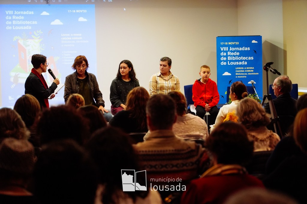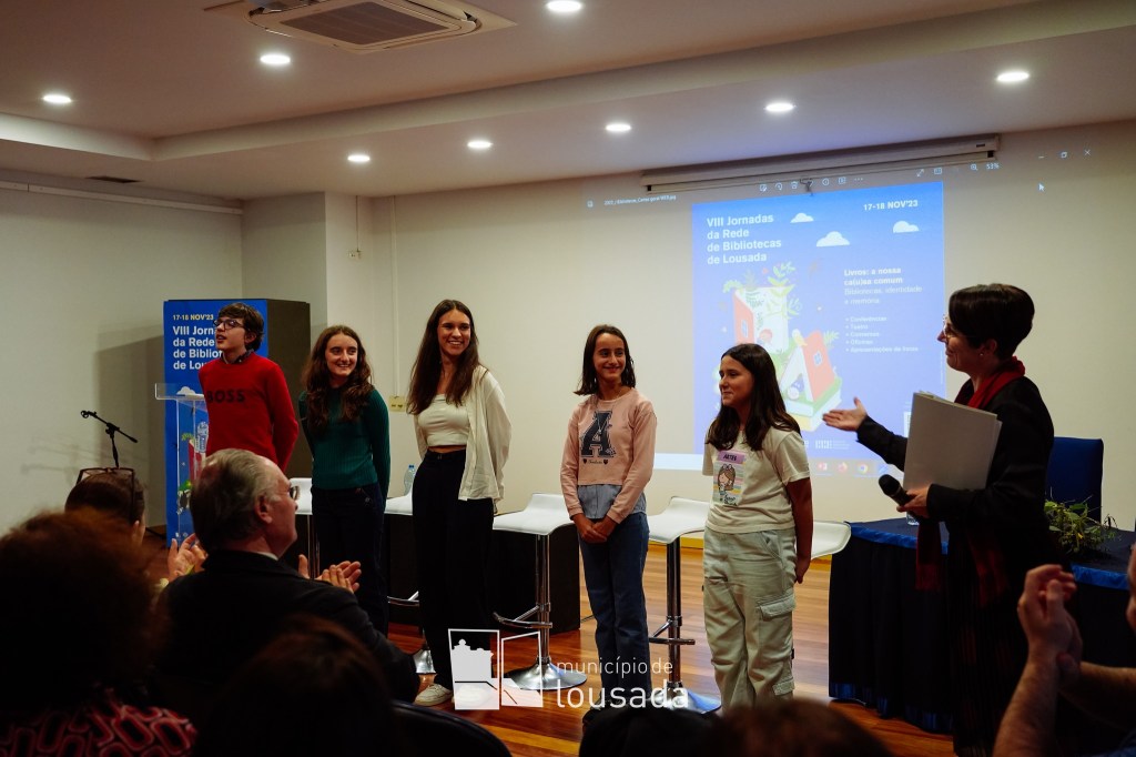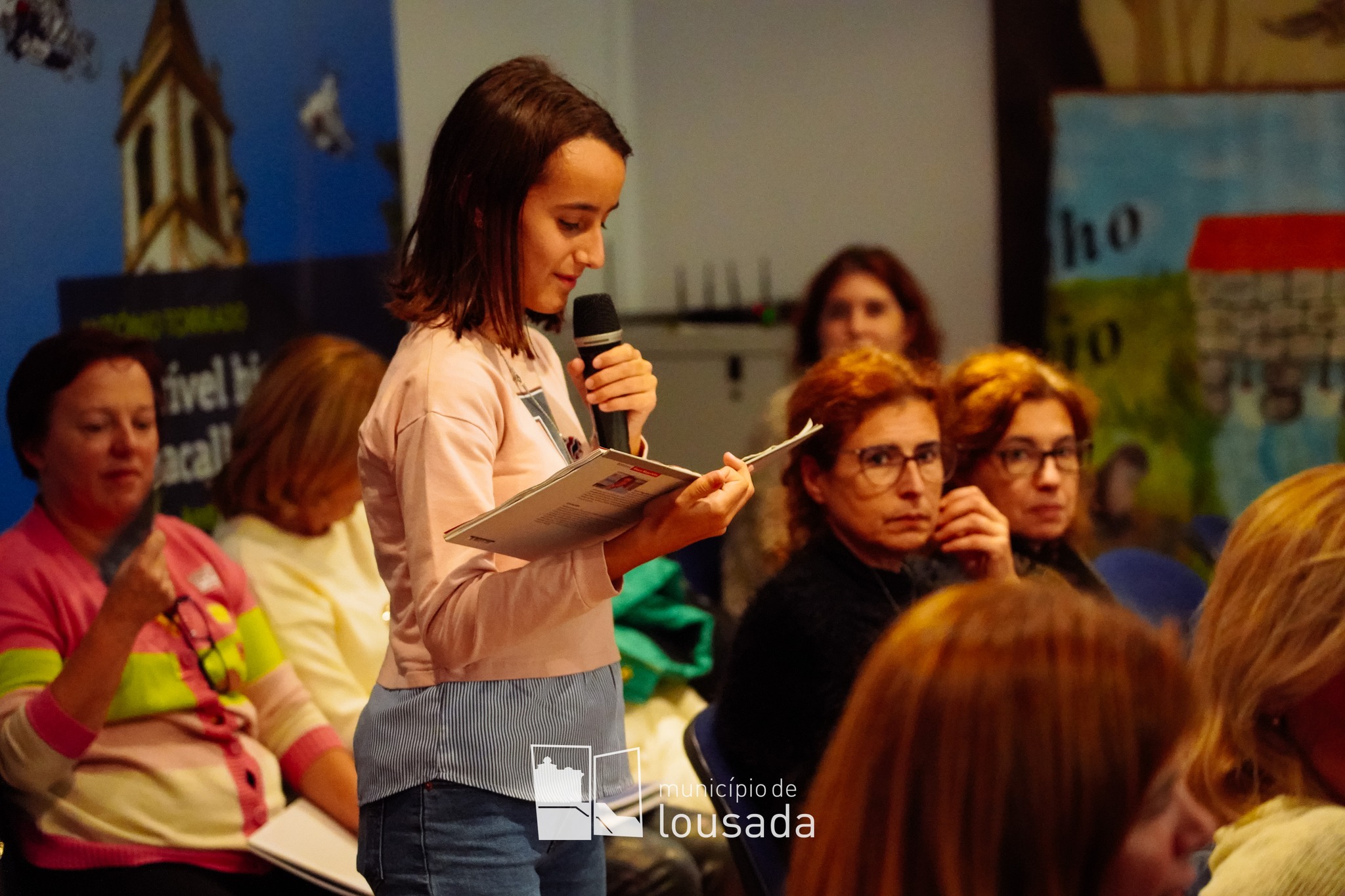 A professora Graça Coelho, acompanhada pelos alunos vencedores do Concurso LER LOUSADA, Guilherme Marinho, do 4.º ano, da EB1 de Pias e Beatriz Alves Neves (ex-aluna do 12.ºano), referiu-se à importância do trabalho que se desenvolve nas bibliotecas e que muito transforma os nossos alunos. Referiu-se ao Concurso de Leitura de Poesia em Rede, aos Concursos de Escrita Literária e de Ilustração e, ainda, ao CNL. Os alunos também deram o seu testemunho.