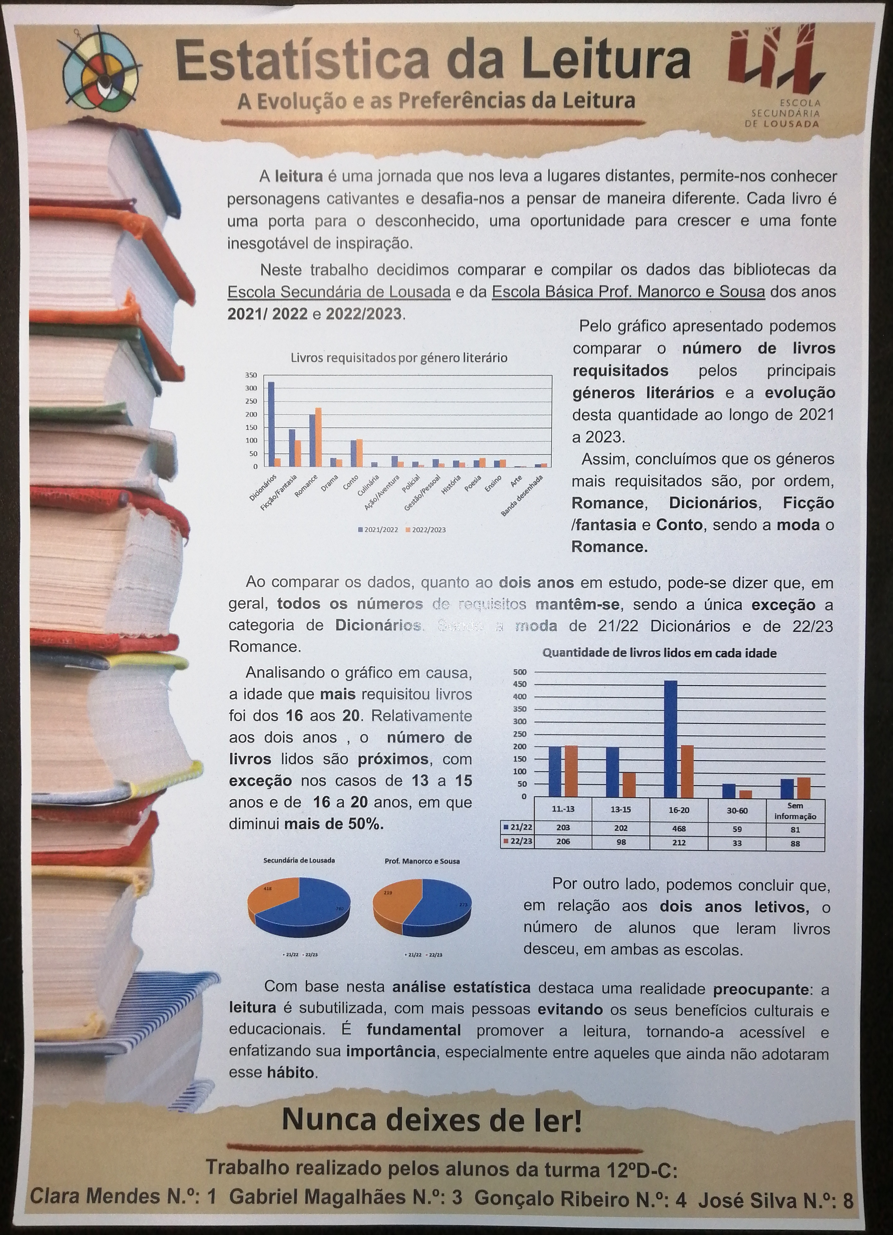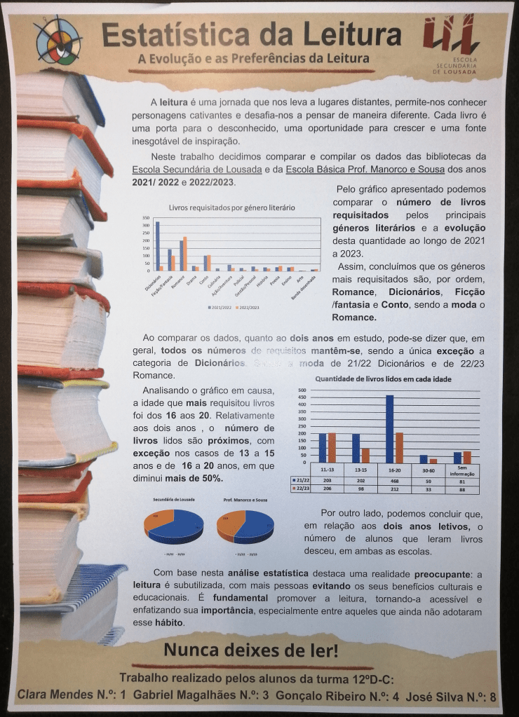 Dez7 Trabalho de Estatística realizado por alunos do 12.º C e D Posted on Dezembro 7, 2023 by AFPA Padrão Muito interessante trabalho realizado pelos alunos de Matemática, do 12.º ano C e D, sob a orientação da professora Albertina Tavares, sobre o tema da “Evolução e as Preferências da Leitura” na Biblioteca Escolar. Partilha: Clique para partilhar no Facebook (Abre numa nova janela) Facebook Click to share on X (Abre numa nova janela) X Clique para partilhar no LinkedIn (Abre numa nova janela) LinkedIn Mais Carregue aqui para imprimir (Abre numa nova janela) Imprimir Clique para partilhar no WhatsApp (Abre numa nova janela) WhatsApp Carregue aqui para enviar por email a um amigo (Abre numa nova janela) E-mail Gosto Carregando... Relacionado