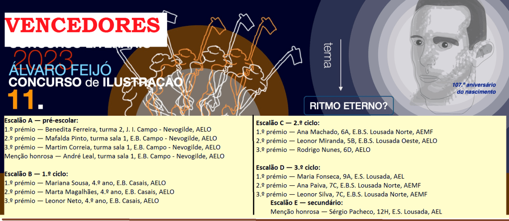 Jan12 VENCEDORES do Concurso de Ilustração Álvaro Feijó 2023 Posted on Janeiro 12, 2024 by AFPA Padrão Os prémios serão entregues nas escolas dos alunos vencedores, em dia e hora a combinar! Parabéns a todos os alunos, professores e encarregados de educação envolvidos! Partilha: Partilhar no Facebook (Abre numa nova janela) Facebook Share on X (Abre numa nova janela) X Share on LinkedIn (Abre numa nova janela) LinkedIn Mais Imprimir (Abre numa nova janela) Imprimir Share on WhatsApp (Abre numa nova janela) WhatsApp Email a link to a friend (Abre numa nova janela) E-mail Gosto Carregando... Relacionado