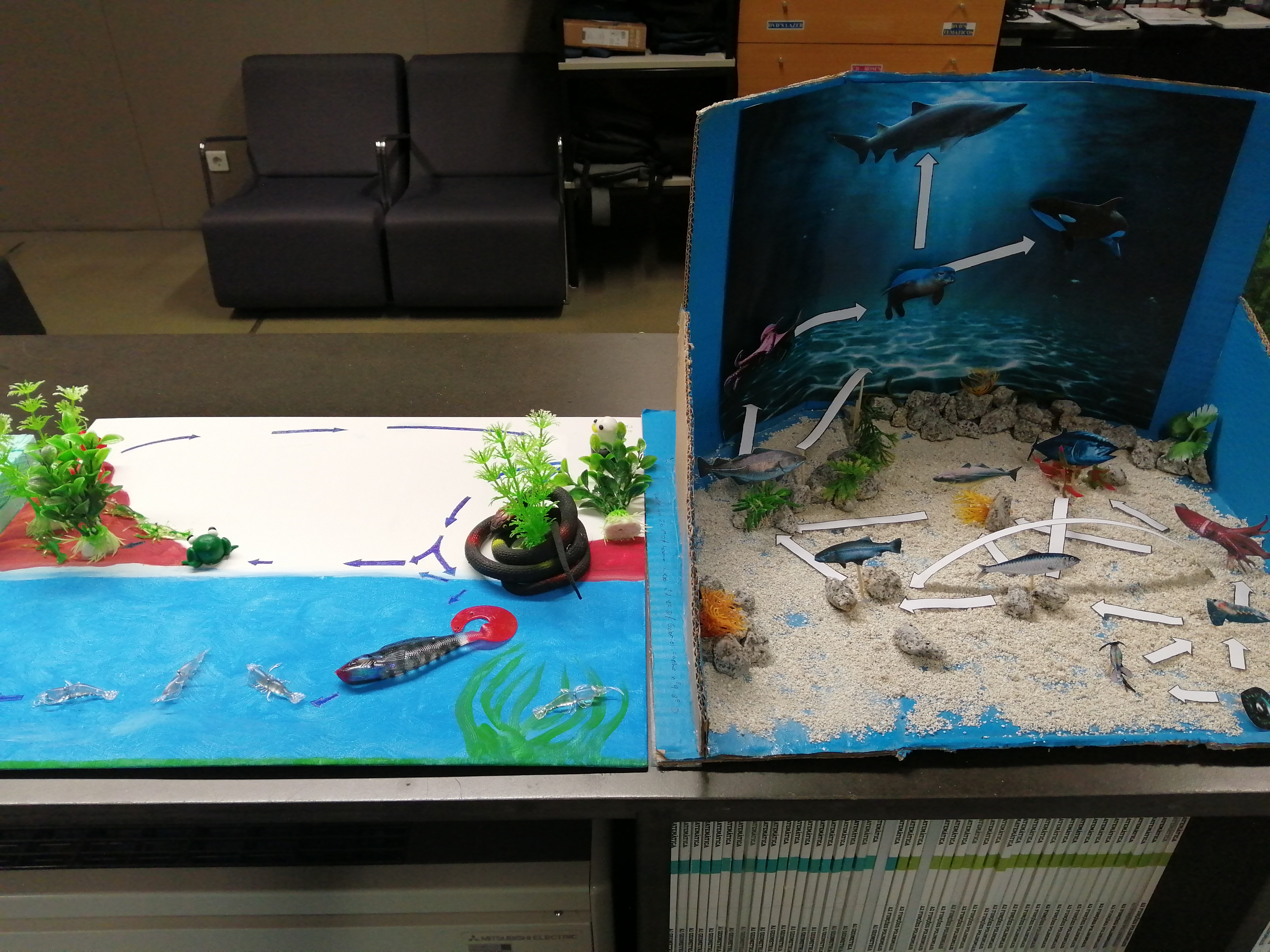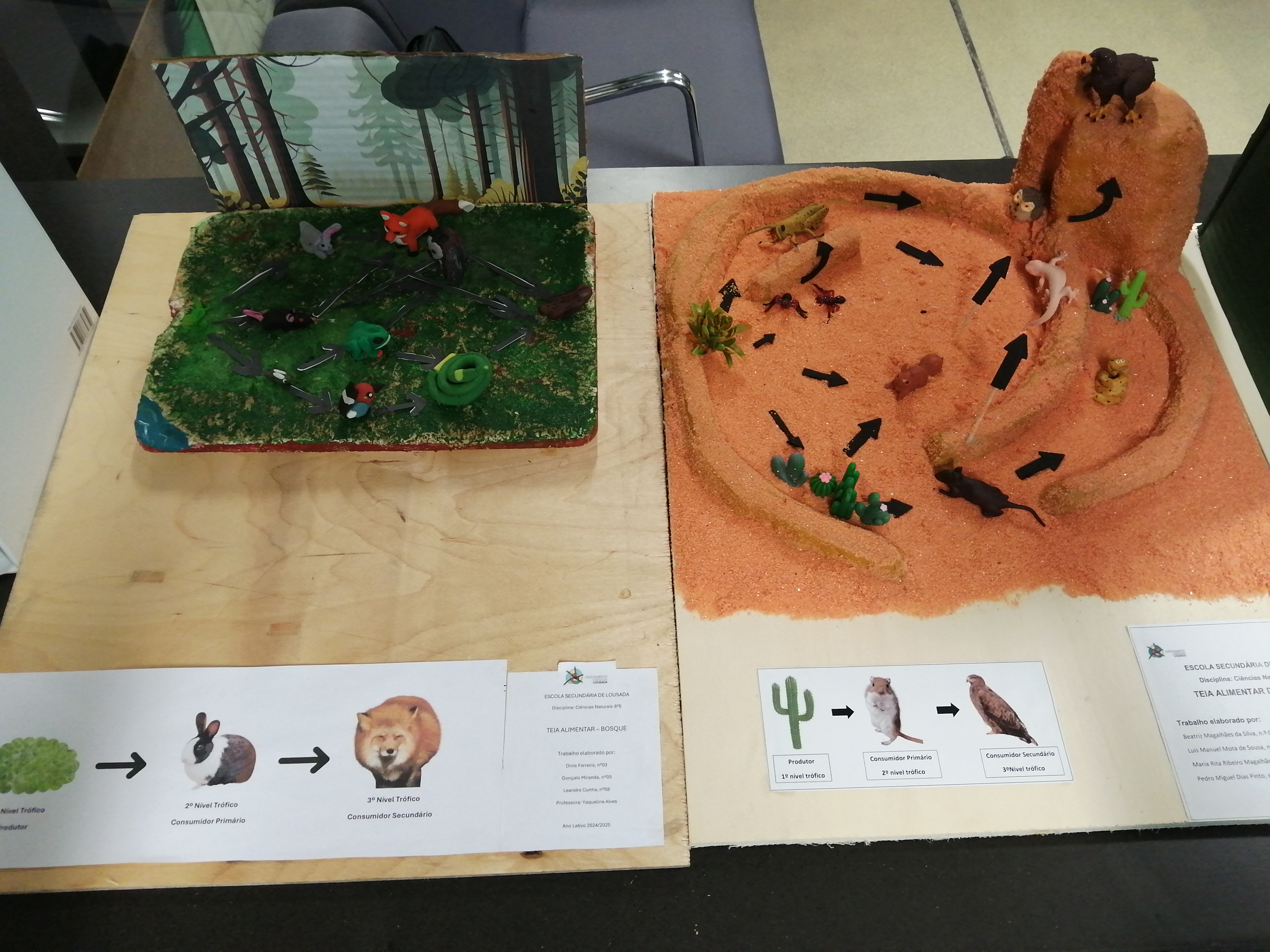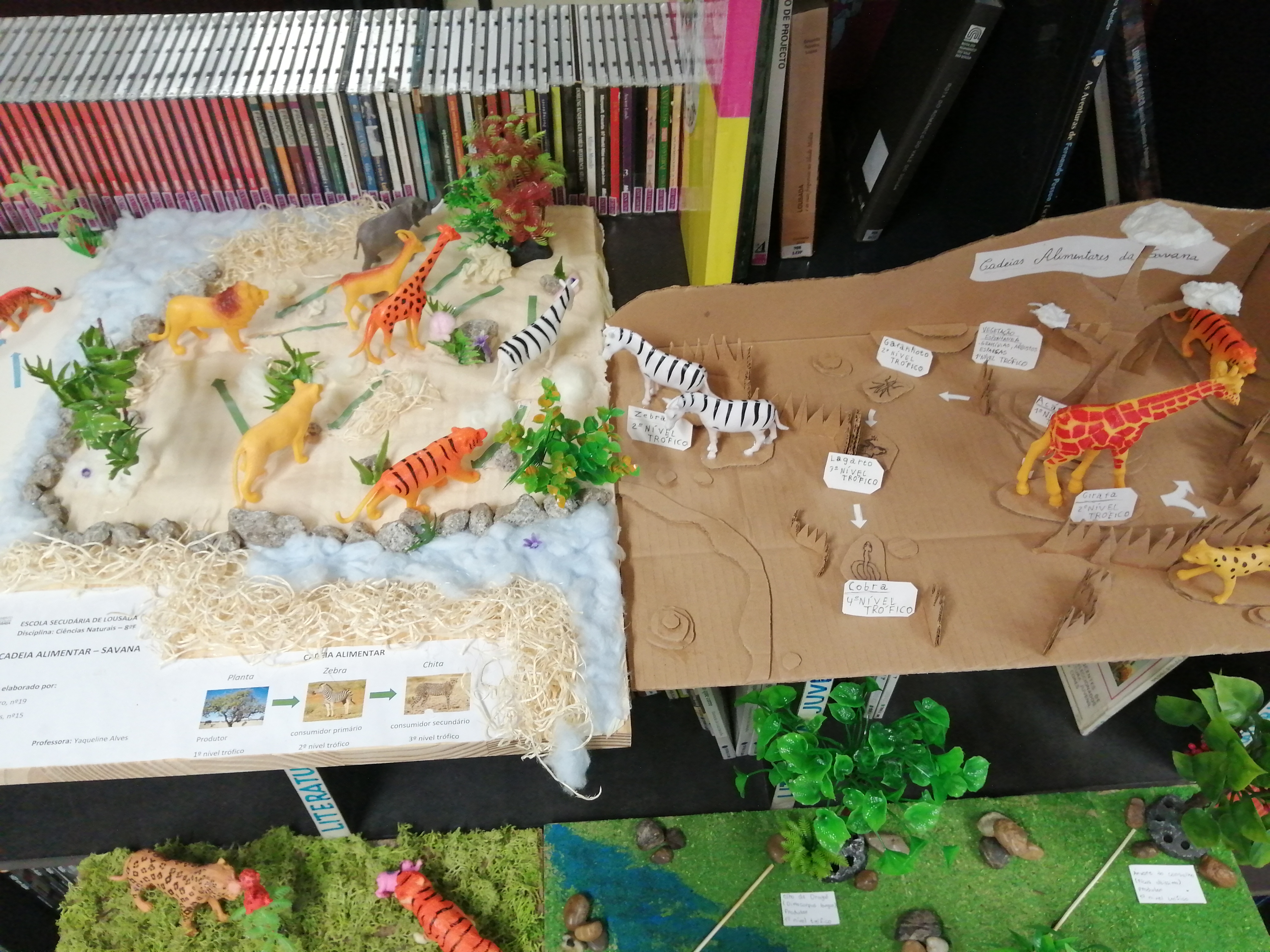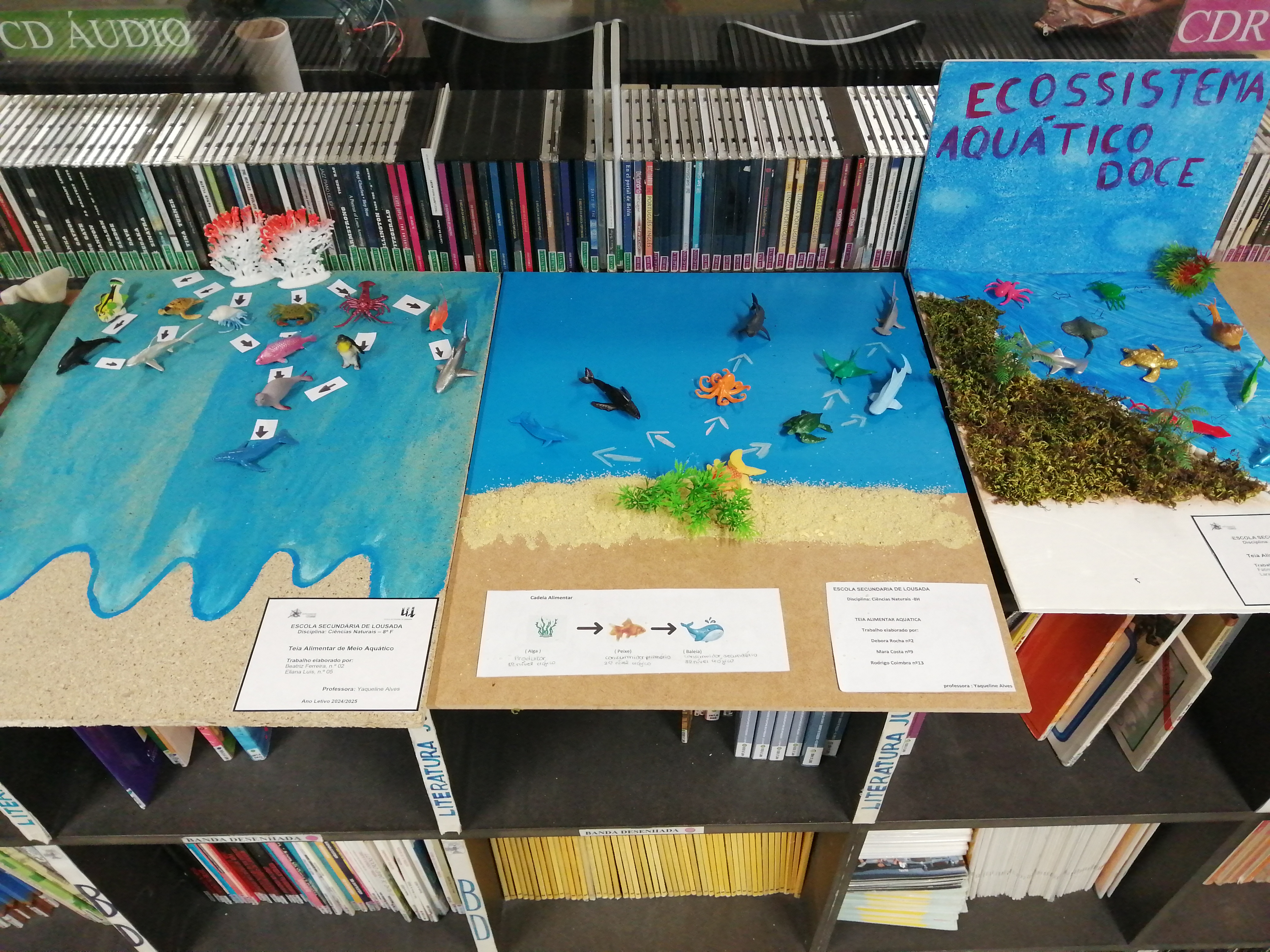 Encontra-se no balcão da biblioteca da Escola Secundária uma exposição de modelos didáticos pedagógicos em 3D, sobre Teias Alimentares.