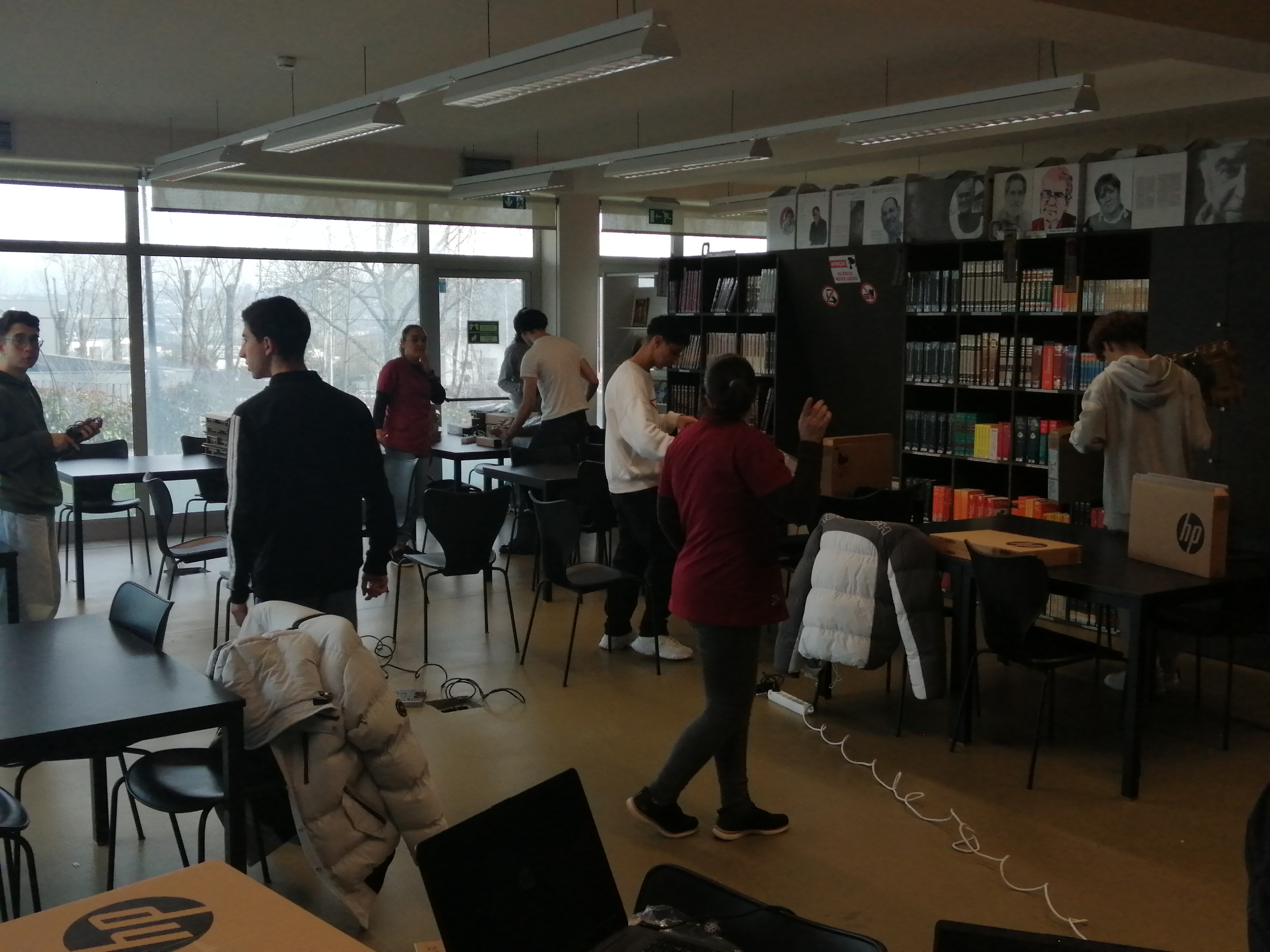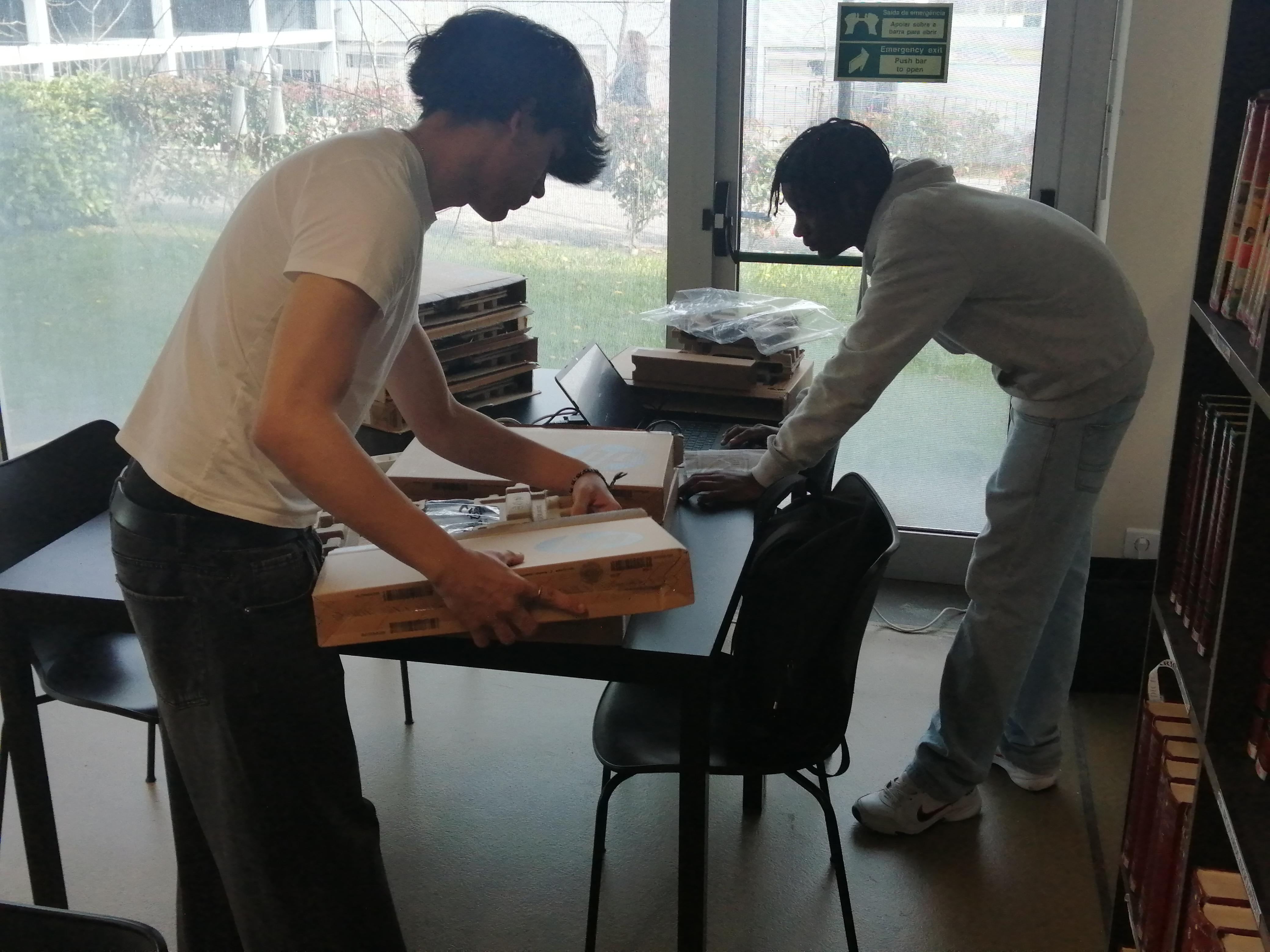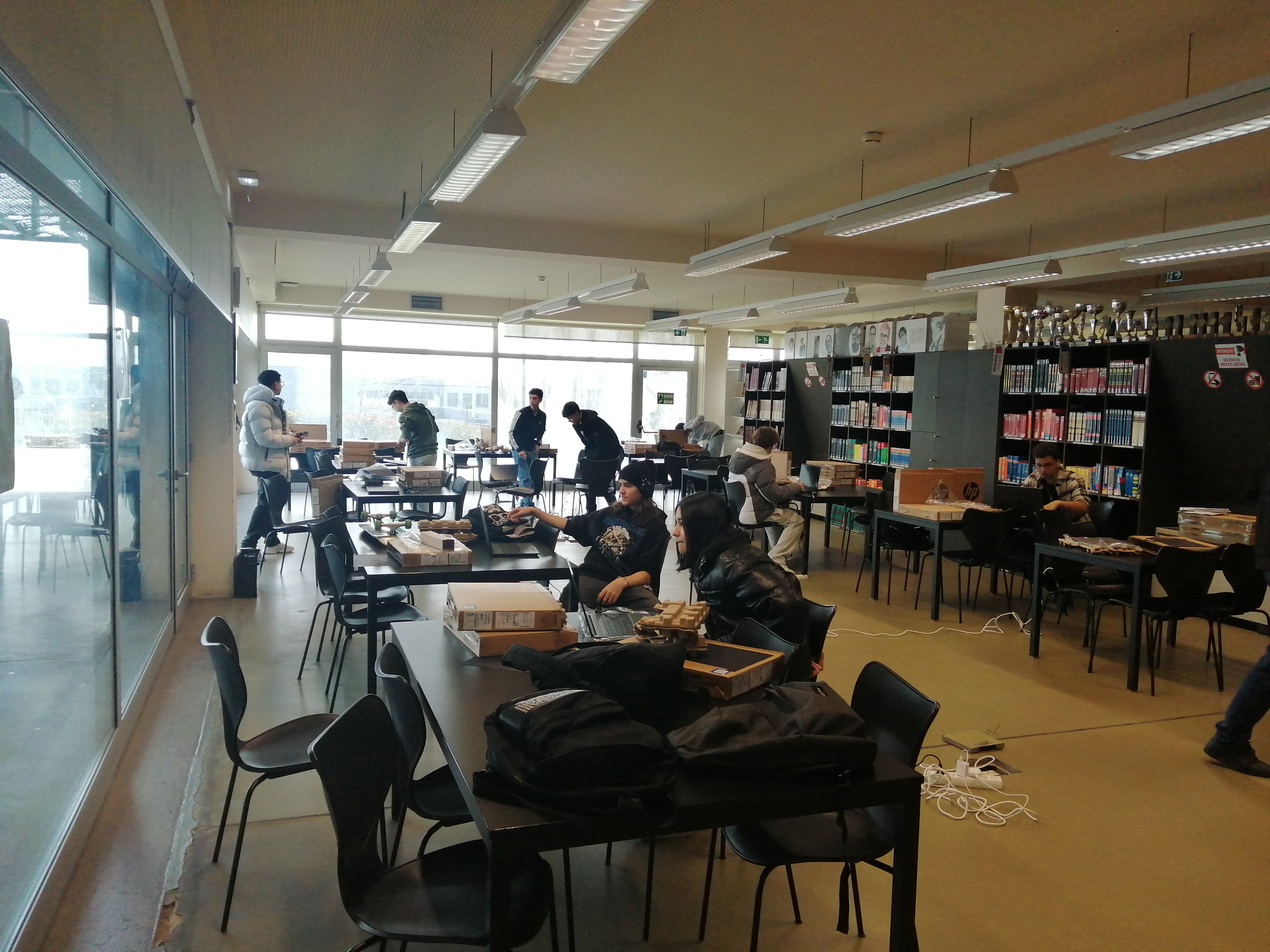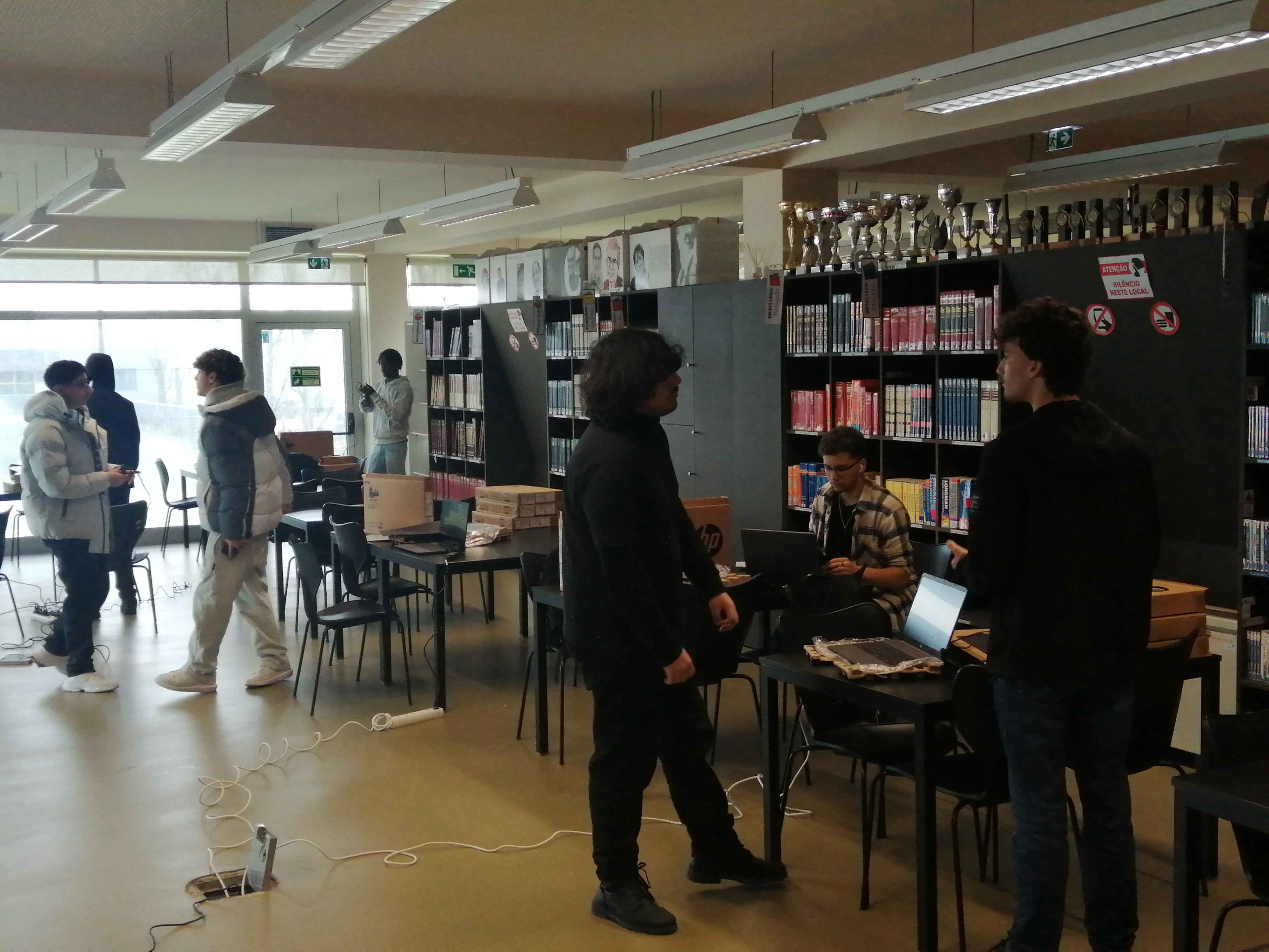 Em contexto de aula, o professor Filipe Matos, juntamente com os alunos da turma 10.º PI, dos cursos profissionais, e as duas Assistentes Operacionais da Biblioteca, estão a preparar cuidadosamente os computadores para que os colegas possam realizar, com tranquilidade, as provas online do IAVE.
