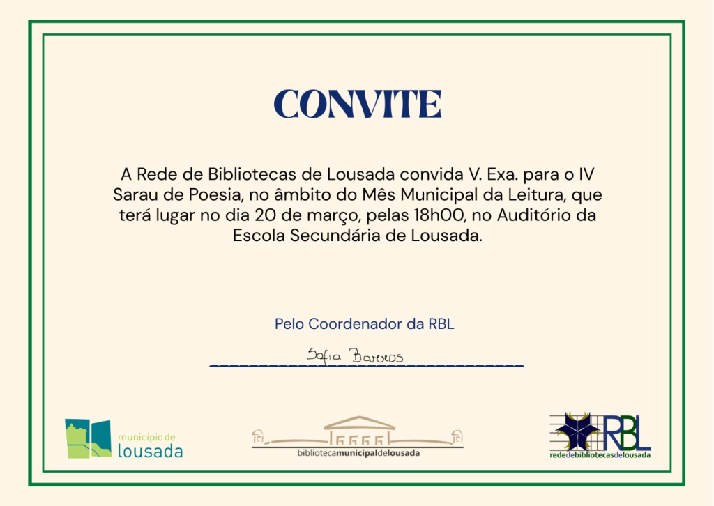 Mar17 IV Sarau de Poesia | 20 março |18 horas | ESL Posted on Março 17, 2026 by AFPA Imagem Partilha: Partilhar no Facebook (Abre numa nova janela) Facebook Share on X (Abre numa nova janela) X Share on LinkedIn (Abre numa nova janela) LinkedIn Mais Imprimir (Abre numa nova janela) Imprimir Share on WhatsApp (Abre numa nova janela) WhatsApp Email a link to a friend (Abre numa nova janela) E-mail Gosto Carregando... Relacionado