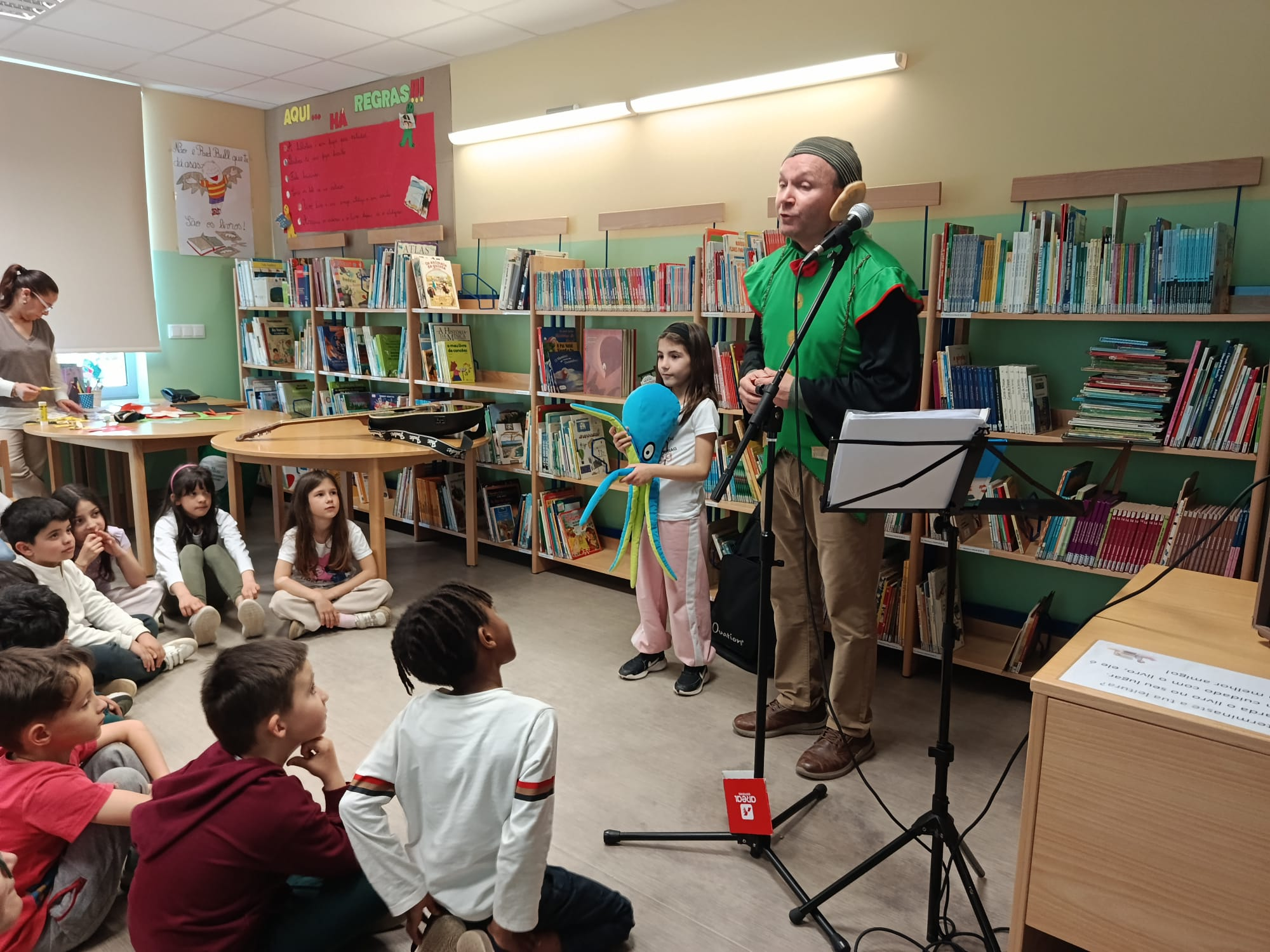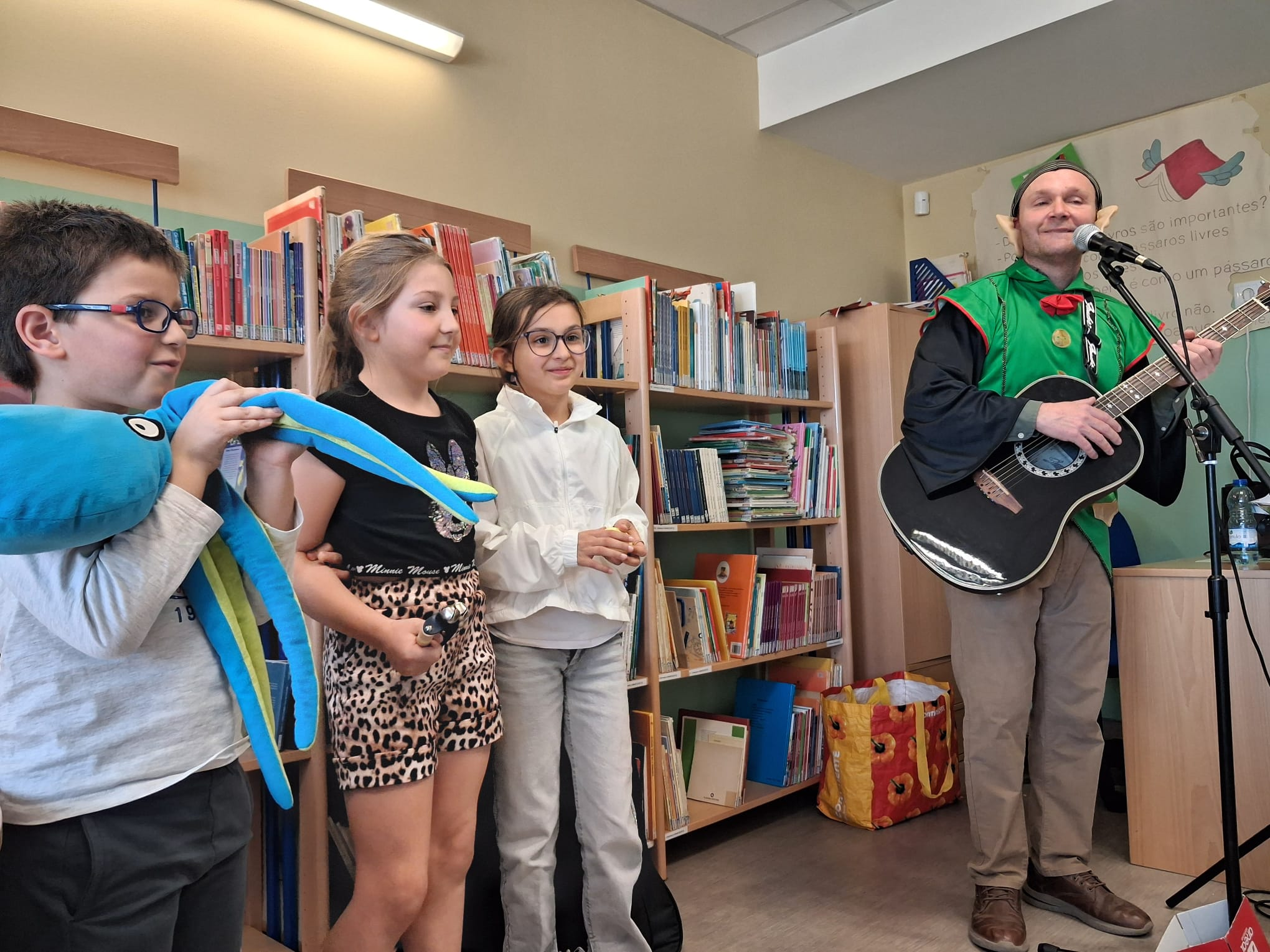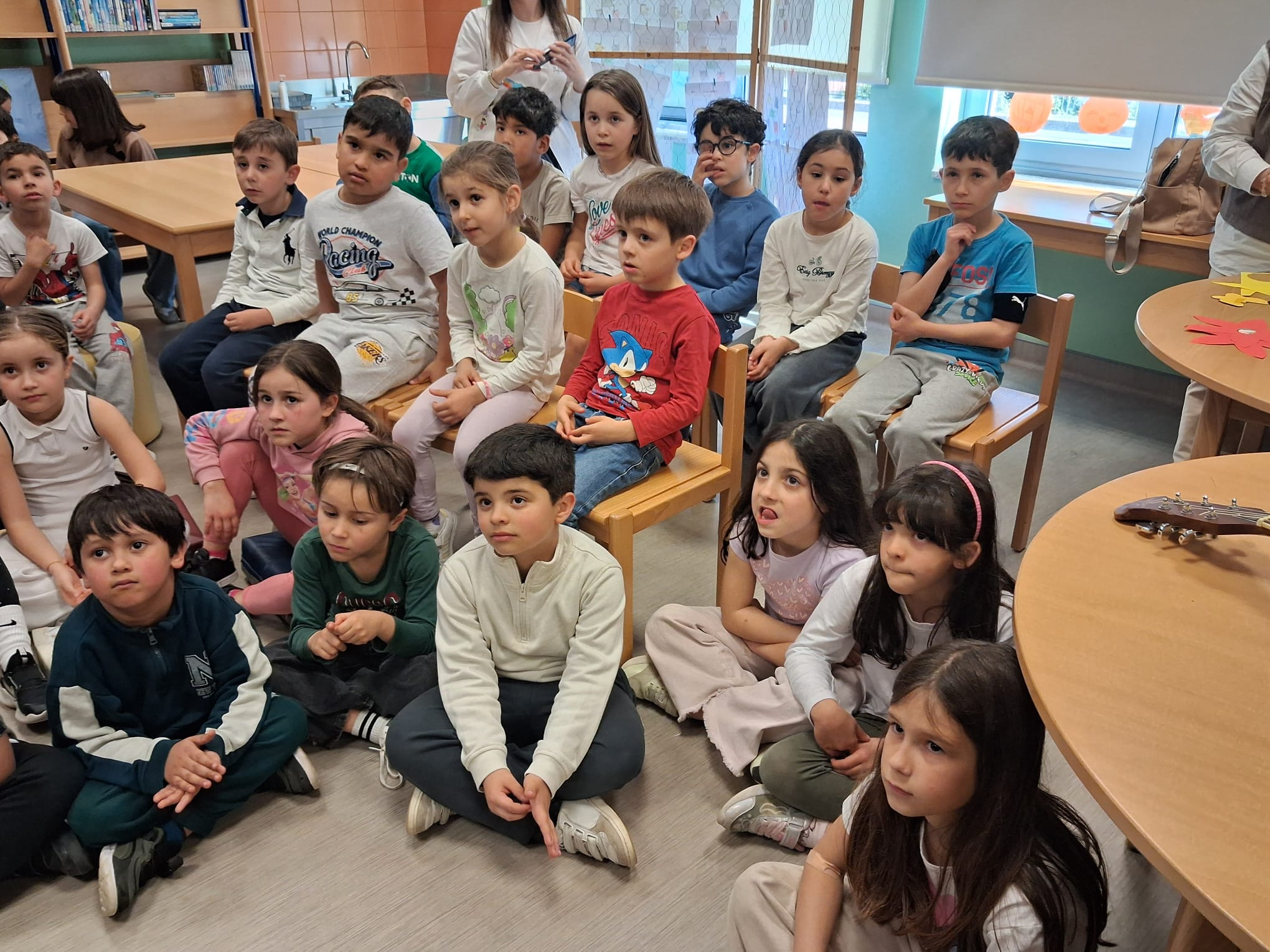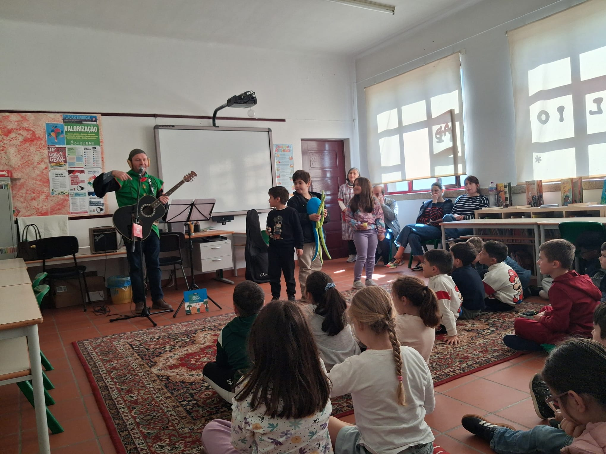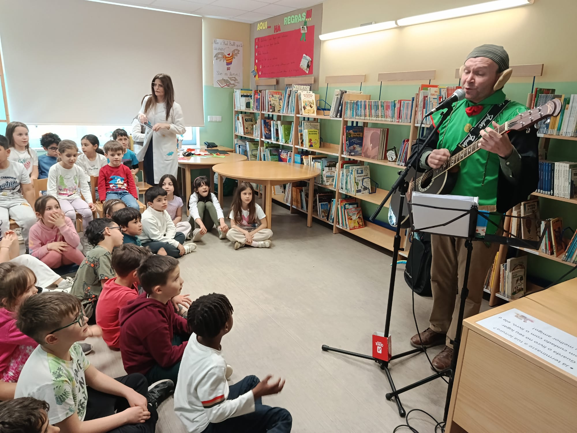 A sessão foi ainda enriquecida por momentos musicais únicos, acompanhados pela sonoridade calorosa e acolhedora da viola. As músicas originais e alegres criaram uma atmosfera de partilha e entusiasmo, permitindo que os alunos se envolvessem ativamente, quer nas histórias, quer nas canções, tornando a experiência ainda mais memorável.