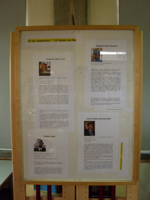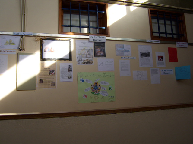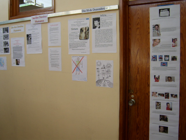 Foi hoje comemorado na Biblioteca da escola o Dia da Declaração Universal dos Direitos Humanos com palestras, exposições de trabalhos dos alunos do básico (com os DT nas aulas de Formação Cívica) e do Secundário, passagem de documentários sobre a Amnistia Internacional, retratos executados pelos alunos de Artes do professor Alexandre Ribeiro e biografias de 10 Prémios Nobel da Paz, executados pelo 12ºE, da professora Teresinha Silva. A exposição estará patente até à próxima semana.
